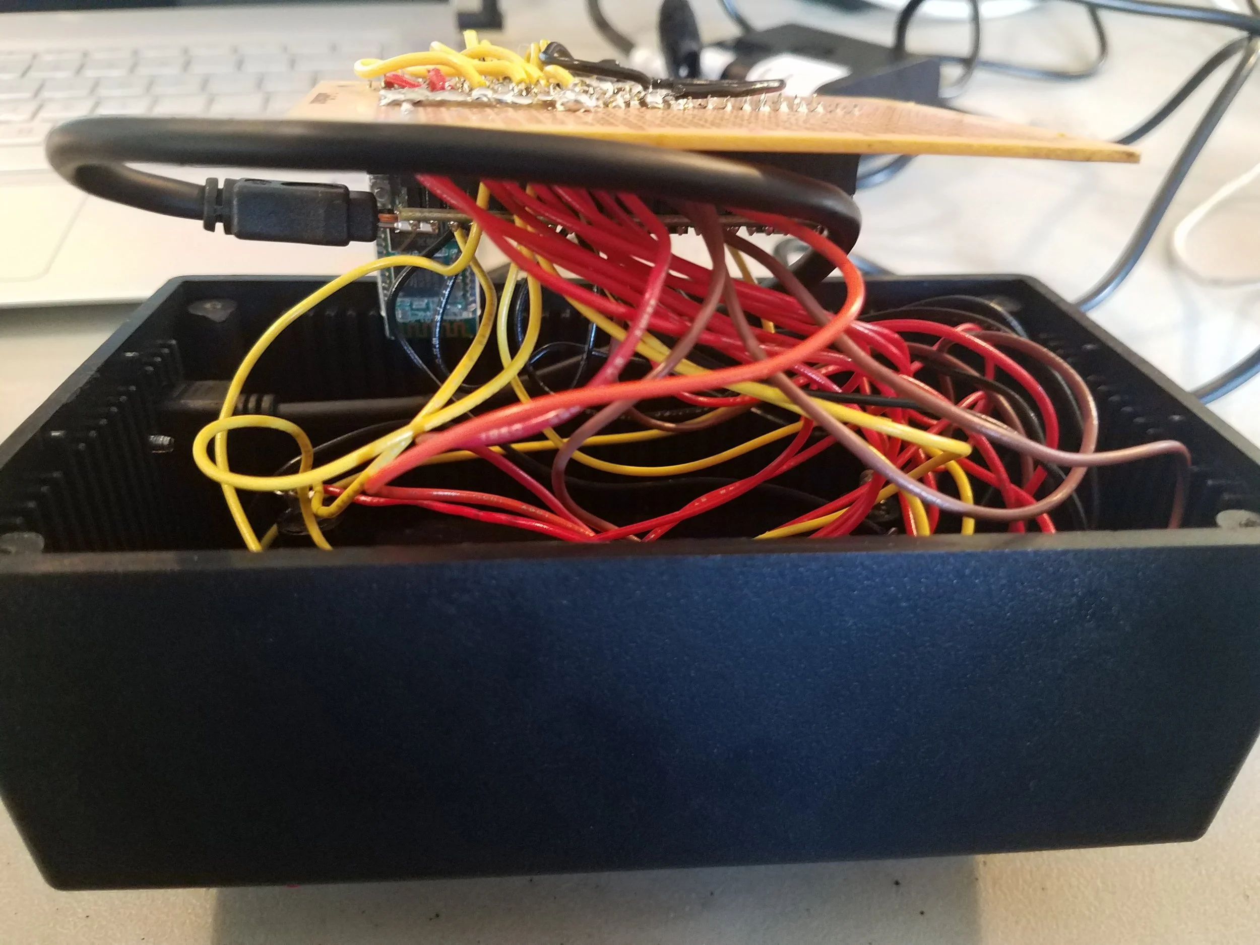 First, of course, we have the transmitter. The transmitter simply consists of a Teensy 3.2, a 3.7V LiPo battery, a triple axis accelerometer, and a Bluetooth module. This is all connected to a perfboard and enclosed in a waterproof Pelican 1010 Micro case.